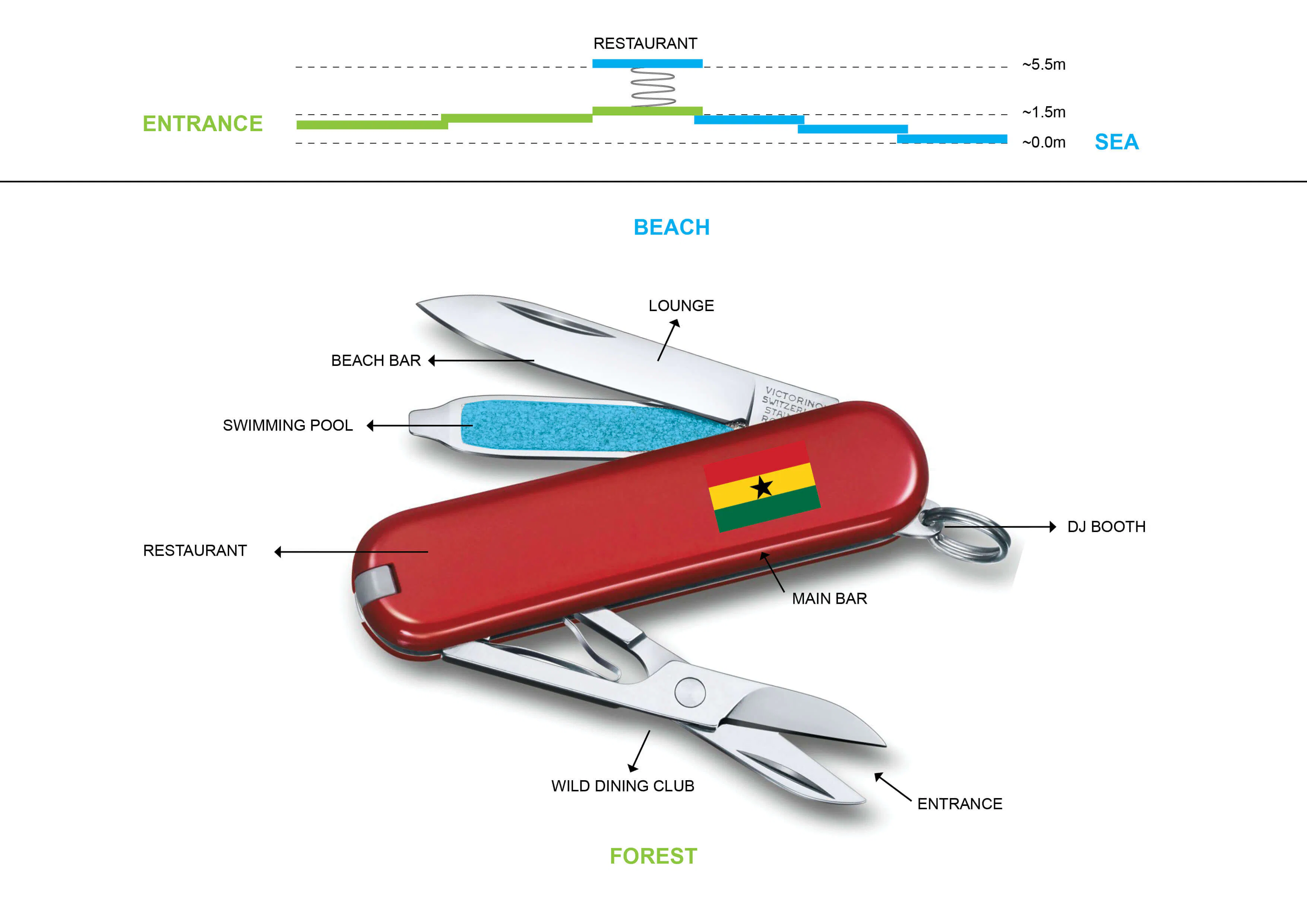 The zig-zag layering of the program enables us to create a series of in-between landscape zones with different themes, which complement the lounge themes. As such, there is a forest private fête at the back of the restaurant, allowing for exclusive group dining; hammock and puff seating is next to the disco lounge; the hanging chairs are next to the group lounge area; the beach bar is next to the pool; the beach armchair lounge is next to the individual lounge, spilling into the beach stools.