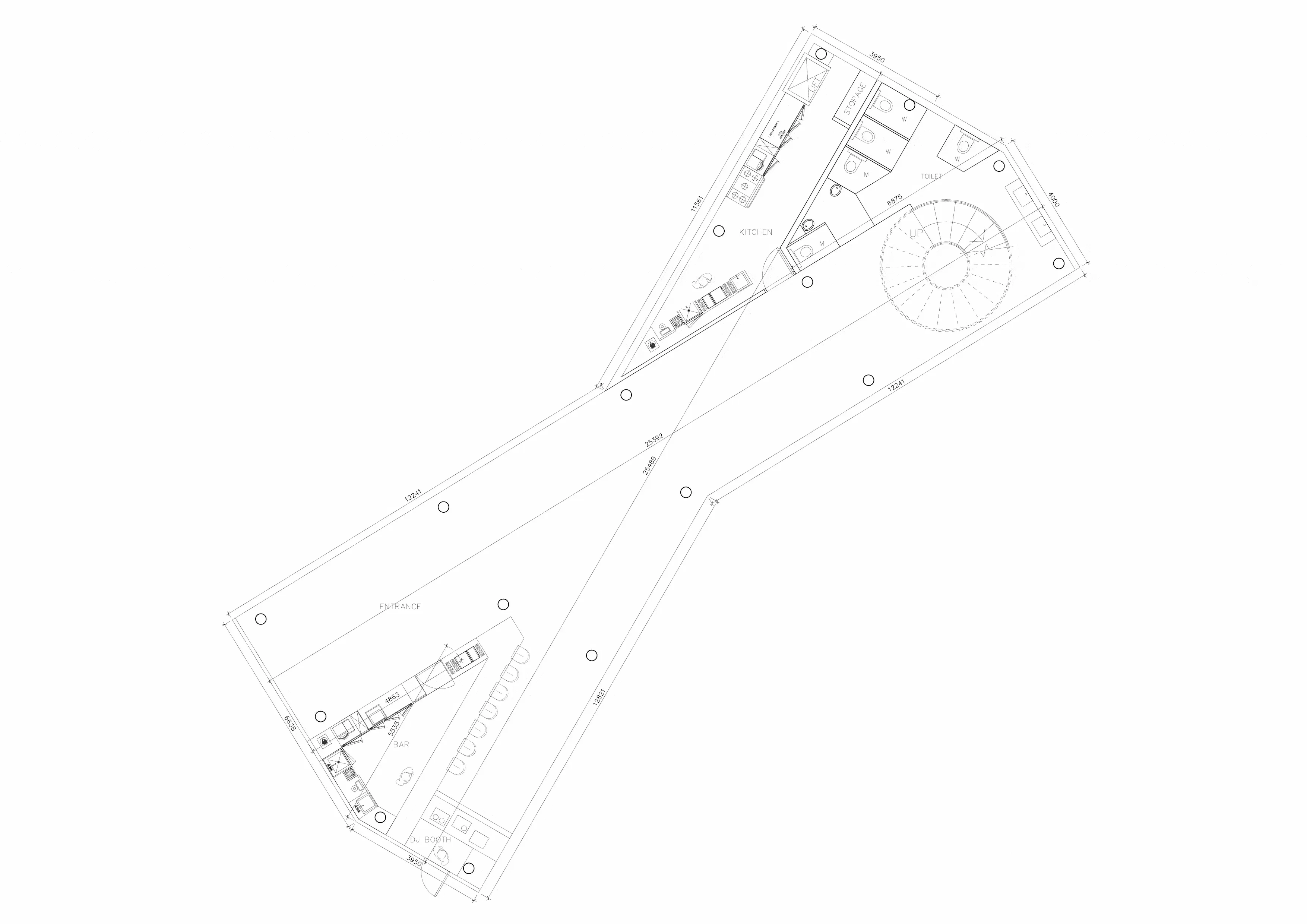 The X layout of the restaurant, created by the zig-zag layering, is fully optimized: on the main level is the main bar with the DJ booth, the back-kitchen, the toilets and the spiral staircase which leads to the upper restaurant deck with the views of the sea, as well as the two balconies for casual outdoor drinks. Beneath the main level is the waterproof storage for all the lounging equipment, ensuring the privacy and floor protection of the majority of the club’s properties.