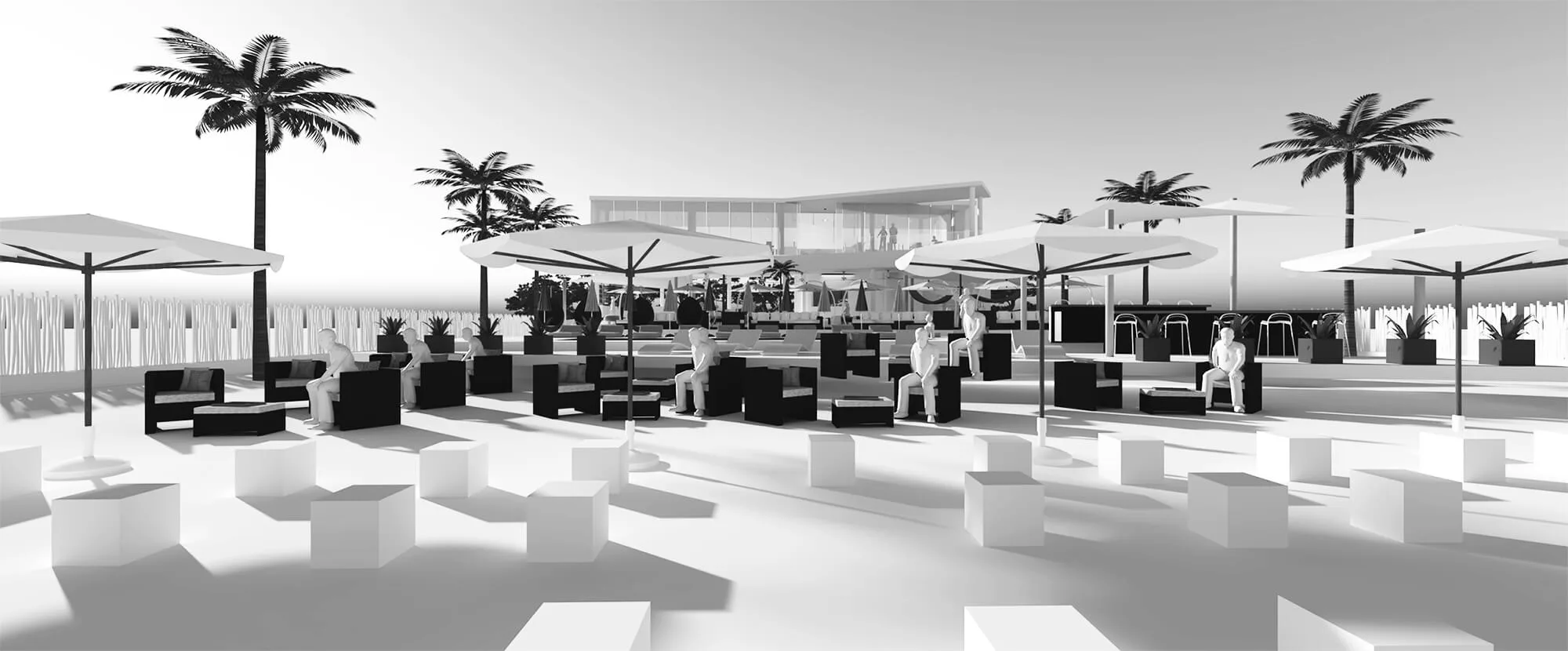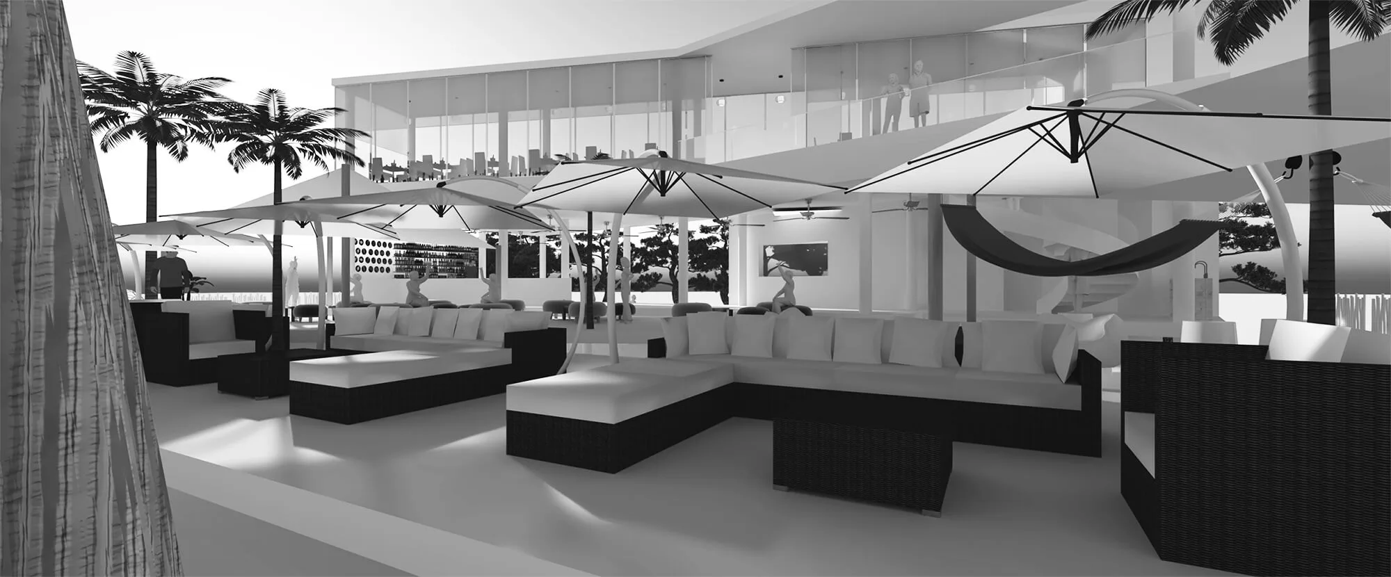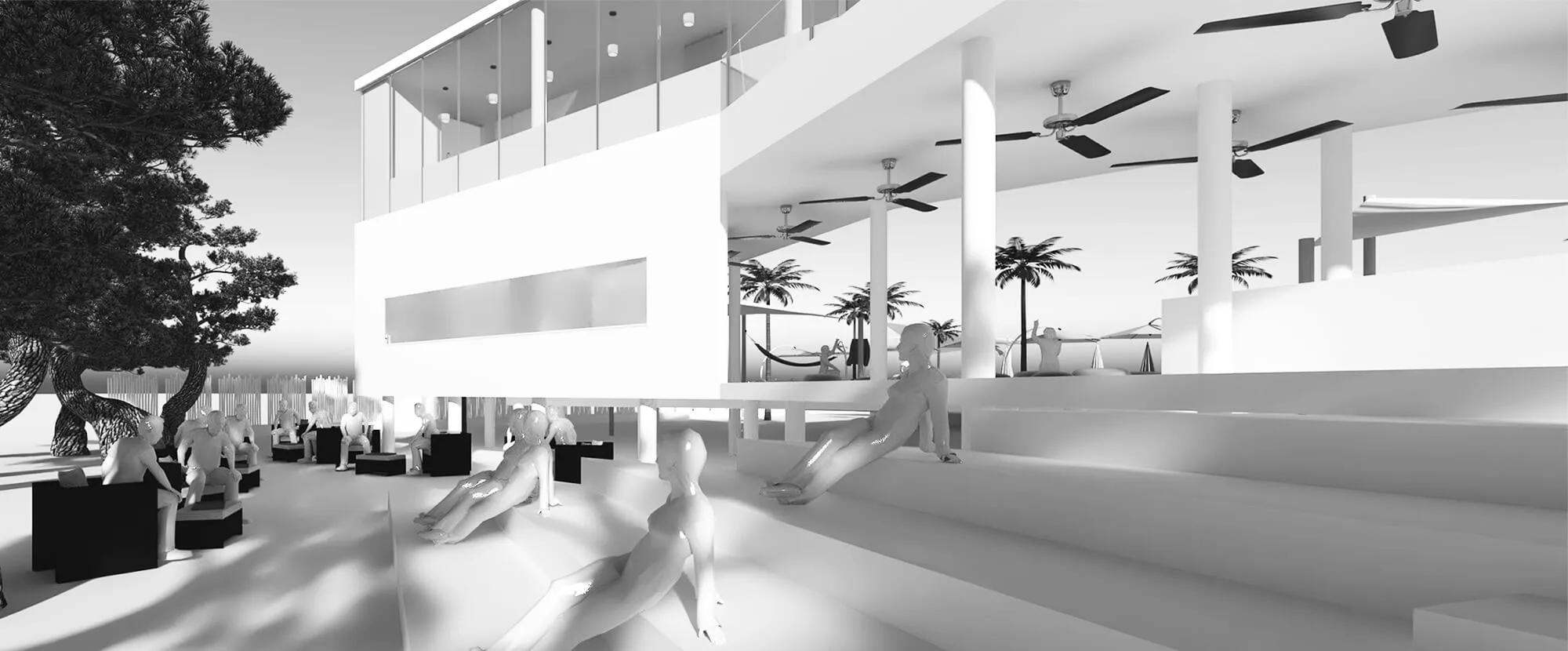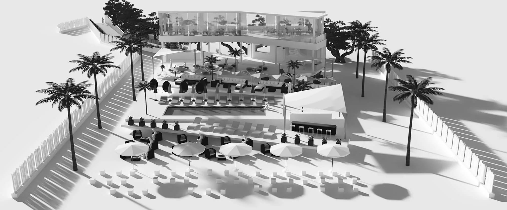 The zig-zag layering of the program enables us to create a series of in-between landscape zones with different themes, which complement the lounge themes. As such, there is a forest private fête at the back of the restaurant, allowing for exclusive group dining; hammock and puff seating is next to the disco lounge; the hanging chairs are next to the group lounge area; the beach bar is next to the pool; the beach armchair lounge is next to the individual lounge, spilling into the beach stools.