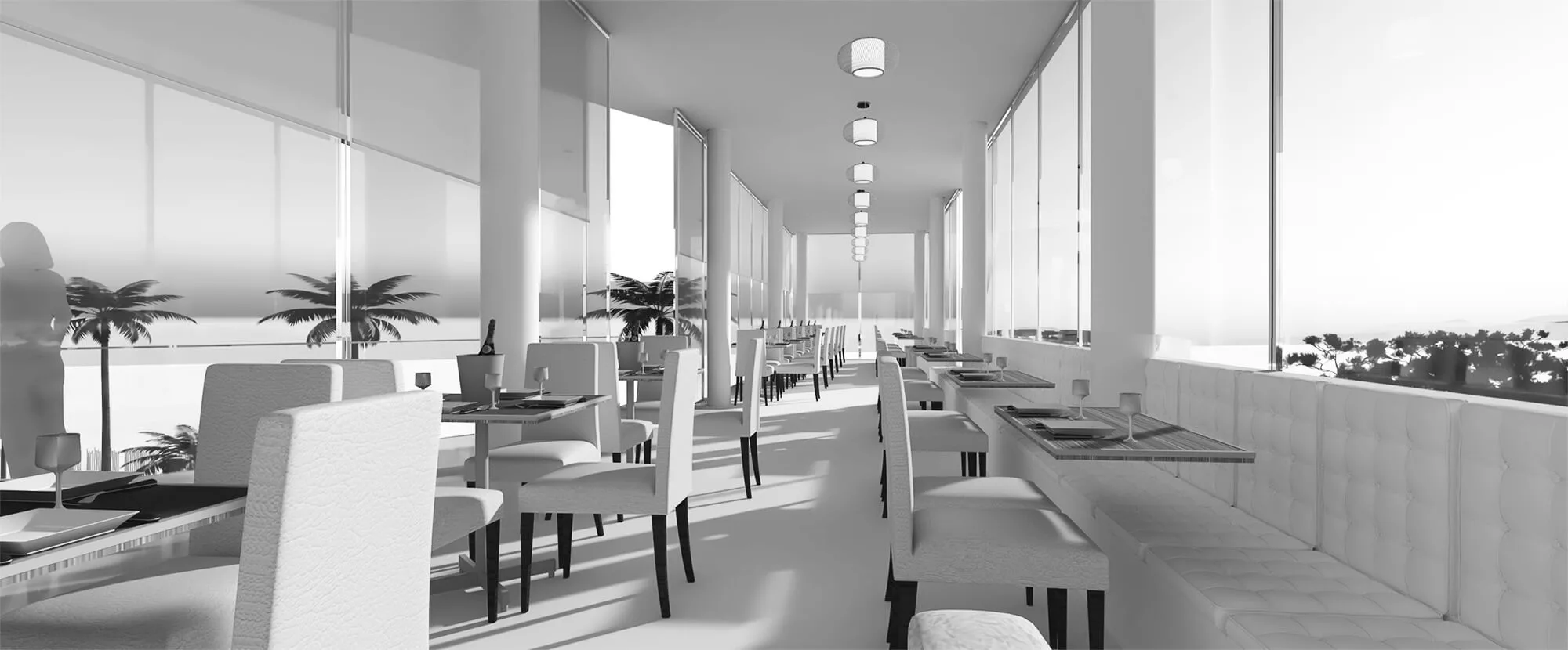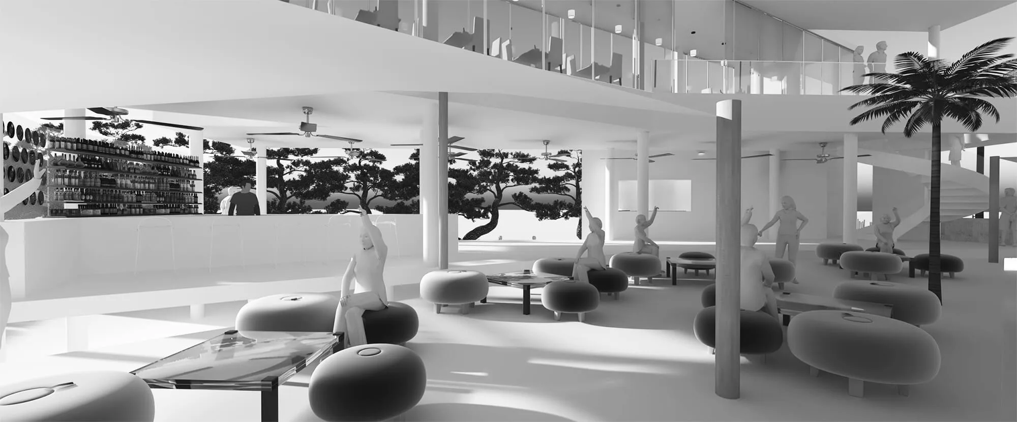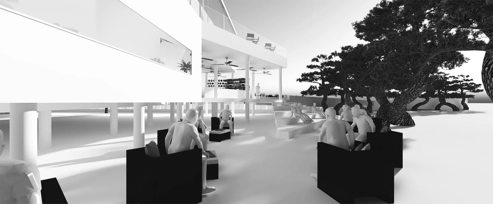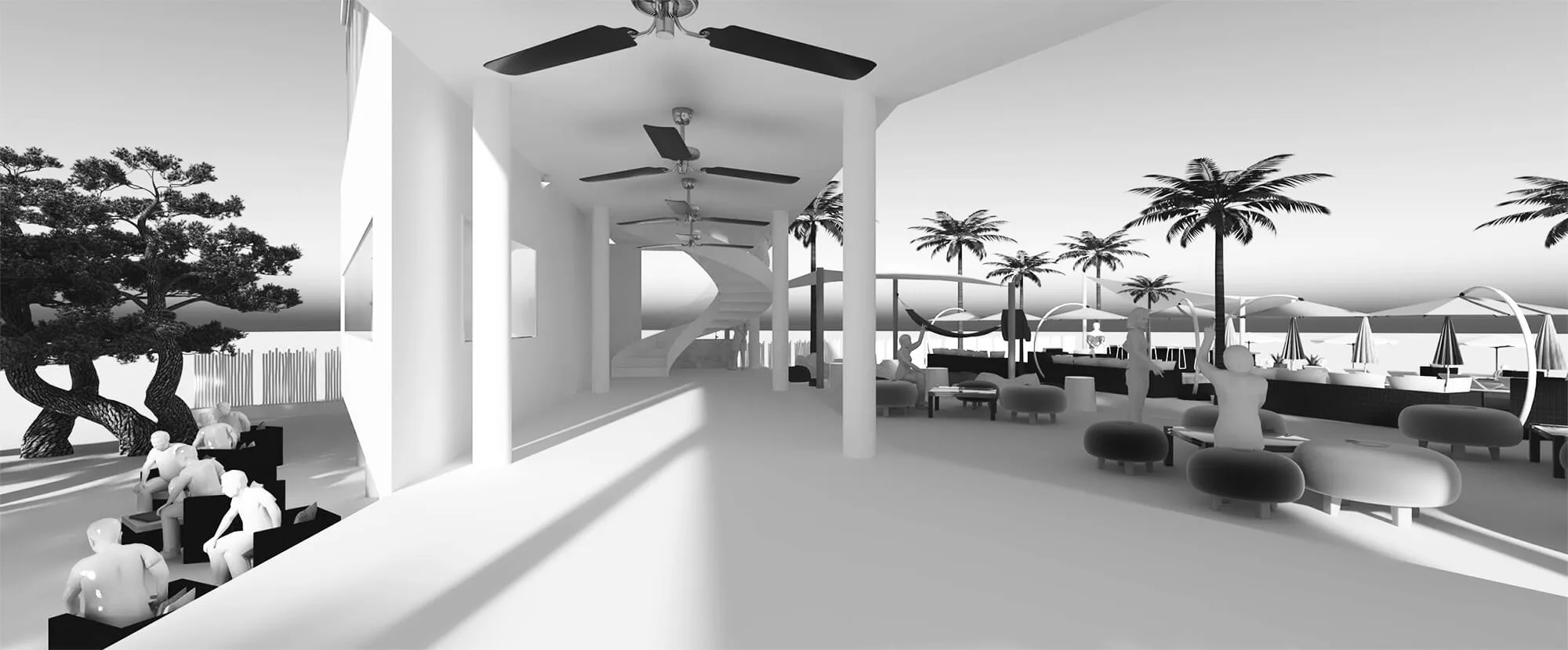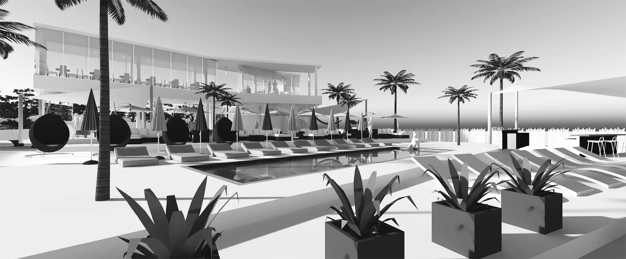 The zig-zag layering of the program enables us to create a series of in-between landscape zones with different themes, which complement the lounge themes. As such, there is a forest private fête at the back of the restaurant, allowing for exclusive group dining; hammock and puff seating is next to the disco lounge; the hanging chairs are next to the group lounge area; the beach bar is next to the pool; the beach armchair lounge is next to the individual lounge, spilling into the beach stools.