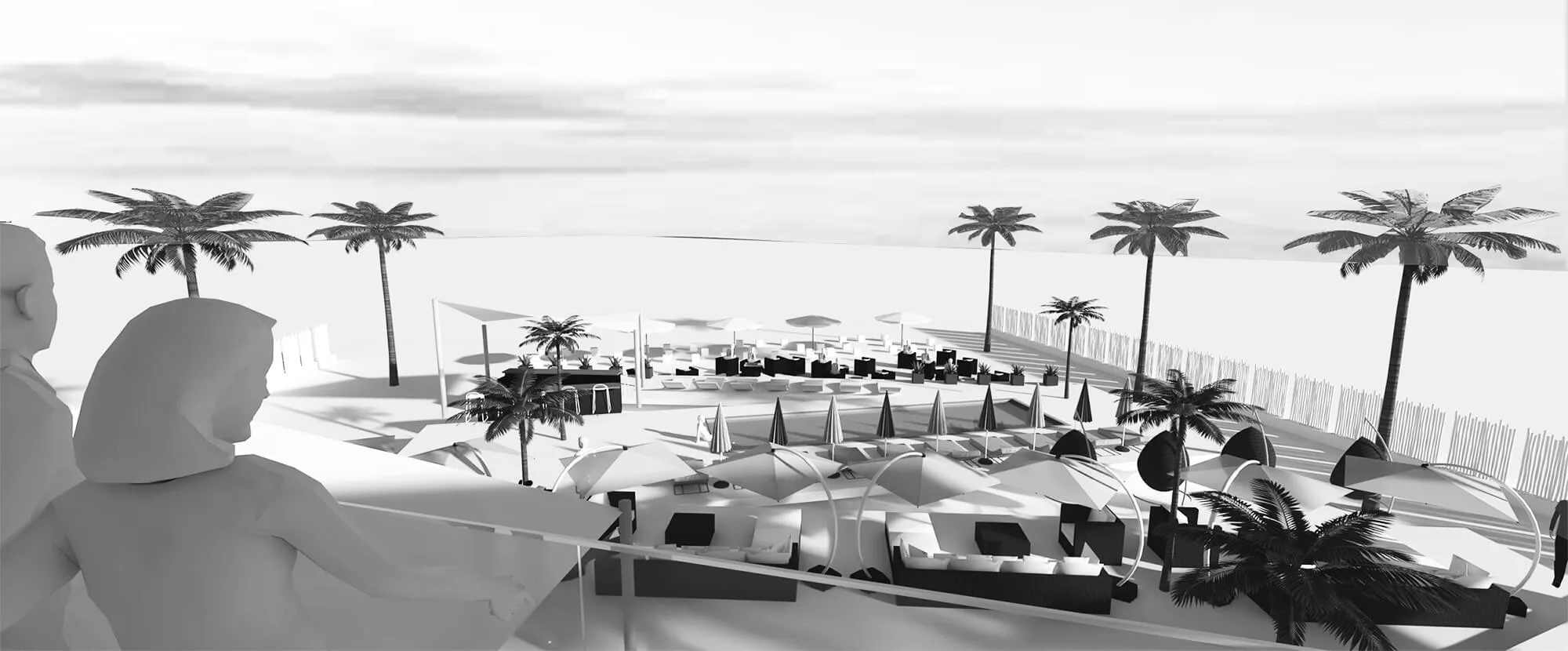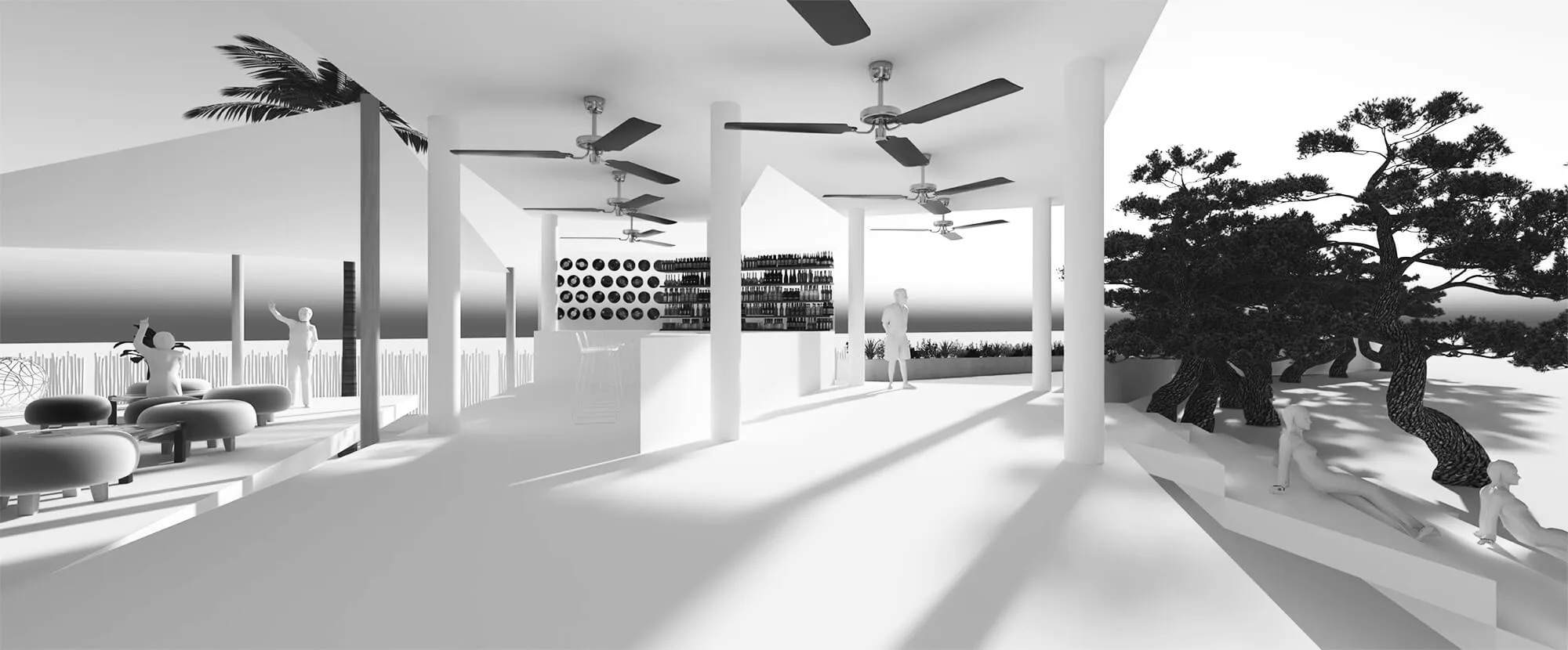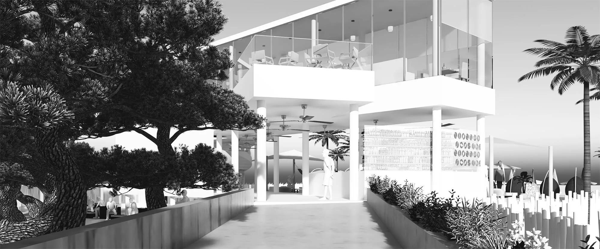 The project is imagined as a series of programs that unfold in front of the guests as they arrive at the club’s VIP parking lot. Like a swiss knife, the programs are divided into zig-zag themed areas which unfold from the parking lot towards the sea, allowing for the restaurant, kitchen and the main bar to remain at the elevated area, whilst the pool and the lounging programs get closer to the sea. Such programmatic zoning ensures that the most expensive programs remain safe in case of a flood.
